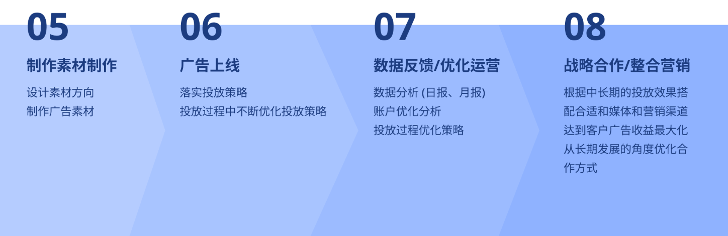 帮助客户在指定媒体平台获取目标用户,为您架设合理的投放逻辑、展现方式、用户定位、出价策略以及定制化的素材设计,确保产品的 有效信息触达受众。